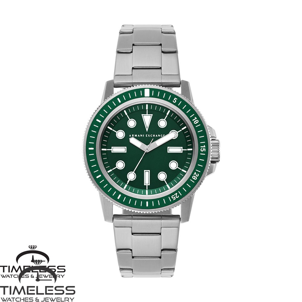Бренд: Armani Exchange Боја: Сребрена, зелена Материјал на ремче: Не рѓосувачки челик Ширина на ремче: 22 мм Дијаметар: 44 мм Материјал на часовник: Не рѓосувачки челик Форма на часовник: Круг Механизам: Кварцен Тип на механизам: Аналоген Отпорност на вода : 5 ATM Пол: Машки Стил: Класика, за секој ден Гаранција: 2 години