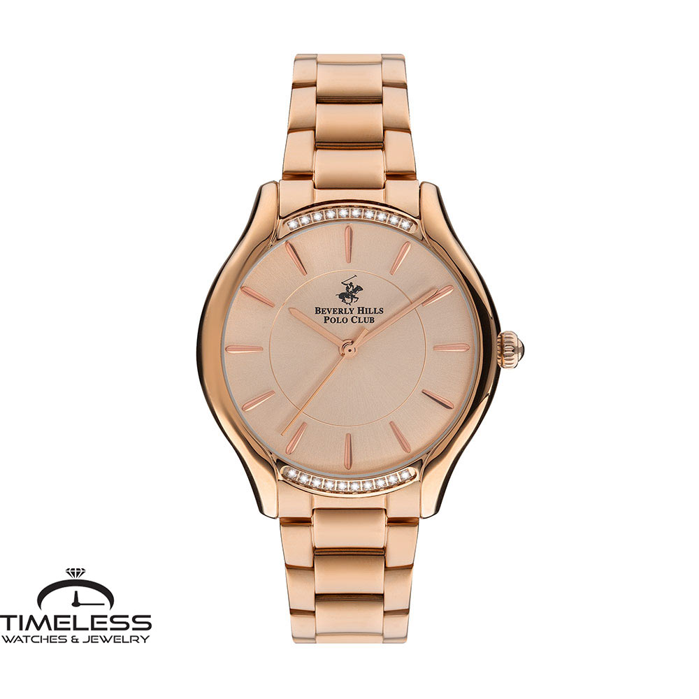 Бренд: Beverly Hills Polo Club Боја: Розово златна Материјал на ремче: Не рѓосувачки челик со кристали Дијаметар: 36 мм Материјал на часовник: Не рѓосувачки челик Форма на часовник: Круг Механизам: Кварцен Тип на механизам: Аналоген Отпорност на вода : 3 ATM Пол: Женски Стил: Класика, елегантен Гаранција: 2 години