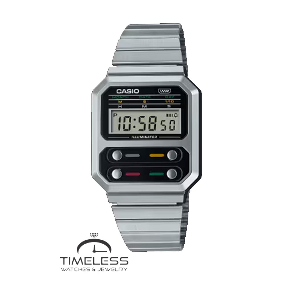 Бренд: Casio Боја: Сребрена, црна Материјал на ремче: Не рѓосувачки челик Ширина на ремче: 18 мм Дијаметар: 33 мм Материјал на часовник: Не рѓосувачки челик Форма на часовник: Шестоаголен Механизам: Кварцен Тип на механизам: Дигитален Календар: Ден, датум, месец Отпорност на вода : 3 ATM Пол: Унисекс Стил: Секојдневен Гаранција: 2 години