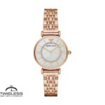 Бренд: Emporio Armani Боја: Розово златна, бела Материјал на ремче: Не рѓосувачки челик Дијаметар: 32 мм Материјал на часовник: Не рѓосувачки челик Форма на часовник: Круг Механизам: Кварцен Тип на механизам: Аналоген Отпорност на вода : 3 ATM Пол: Женски Стил: Класика, за секој ден Гаранција: 2 години