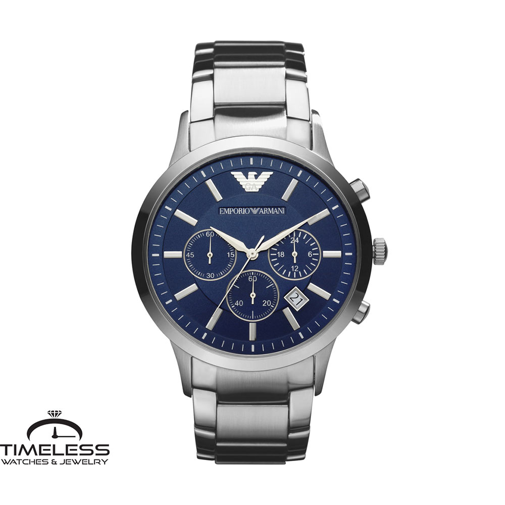 Бренд: Emporio Armani Боја: Сребрена, сина Материјал на ремче: Не рѓосувачки челик Ширина на ремче: 22 мм Дијаметар: 43 мм Материјал на часовник: Не рѓосувачки челик Форма на часовник: Круг Механизам: Кварцен Тип на механизам: Аналоген со хронограф Календар: Датум Отпорност на вода : 5 ATM Пол: Машки Стил: Класика, за секој ден Гаранција: 2 години