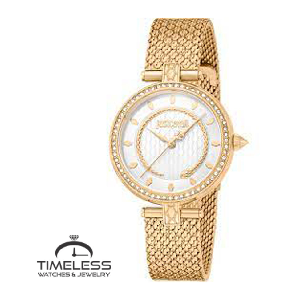 Бренд: Just Cavalli Боја: Златна Материјал на ремче: Не рѓосувачки челик Дијаметар: 34 мм Материјал на часовник: Не рѓосувачки челик, кристали Форма на часовник: Круг Механизам: Кварцен Тип на механизам: Аналоген Отпорност на вода : 3 ATM Пол: Женски Стил: Класика, за секој ден Гаранција: 2 години