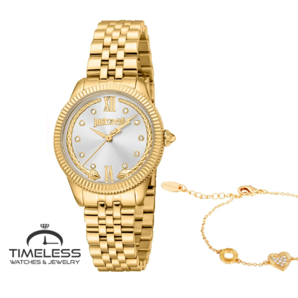 Бренд: Just Cavalli Боја: Златна Материјал на ремче: Не рѓосувачки челик Дијаметар: 34 мм Материјал на часовник: Не рѓосувачки челик, кристали Форма на часовник: Круг Механизам: Кварцен Тип на механизам: Аналоген Отпорност на вода : 3 ATM Пол: Женски Стил: Класика, за секој ден Гаранција: 2 години