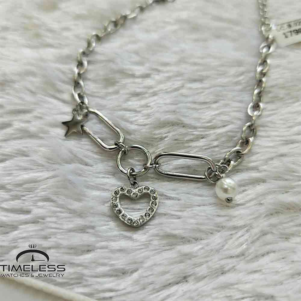 Бренд: Lee Cooper Боја: Сребрена Материјал: Нерѓосувачки челик, бисери, циркони Должина на нараквица: Прилагодлива големина Стил: Елегантен, за секој ден Пол: Женски Гаранција: 1 година