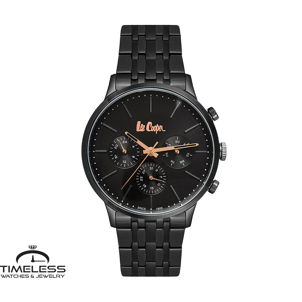 Бренд: Lee Cooper Боја: Црна Материјал на ремче: Не рѓосувачки челик Дијаметар: 44 мм Материјал на часовник: Не рѓосувачки челик Форма на часовник: Круг Механизам: Кварцен Тип на механизам: Аналоген Календар : Ден, датум Отпорност на вода : 3 ATM Пол: Машки Стил: Класика, за секој ден Гаранција: 2 години