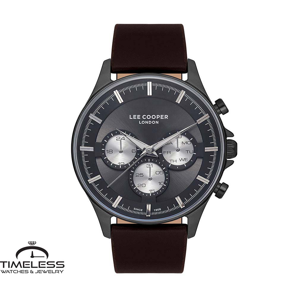 Бренд: Lee Cooper Боја: Темно кафеава, сива Материјал на ремче: Кожно Дијаметар: 45 мм Материјал на часовник: Не рѓосувачки челик Форма на часовник: Круг Механизам: Кварцен Тип на механизам: Аналоген Отпорност на вода : 3 ATM Календар: Ден, датум Пол: Машки Стил: Класика, елегантен Гаранција: 2 години