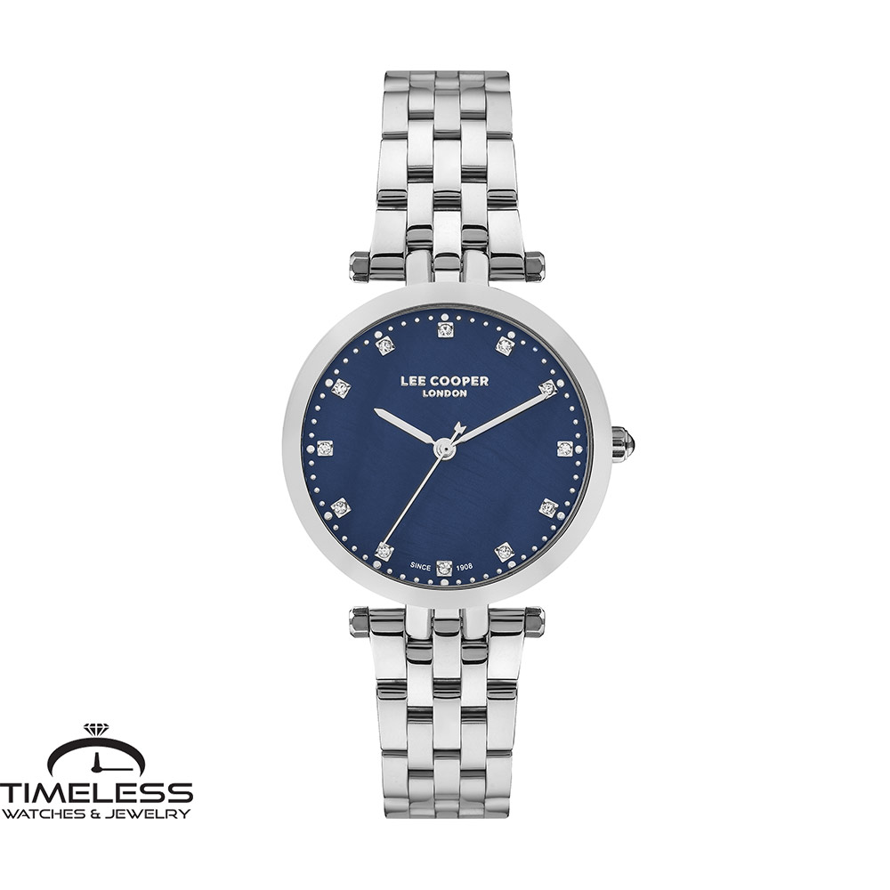 Бренд: Lee Cooper Боја: Сребрена, сина Материјал на ремче: Не рѓосувачки челик Материјал на часовник: Не рѓосувачки челик, кристали Форма на часовник: Круг Механизам: Кварцен Тип на механизам: Аналоген Отпорност на вода : 3 ATM Пол: Женски Стил: Класика, за секој ден Гаранција: 2 години