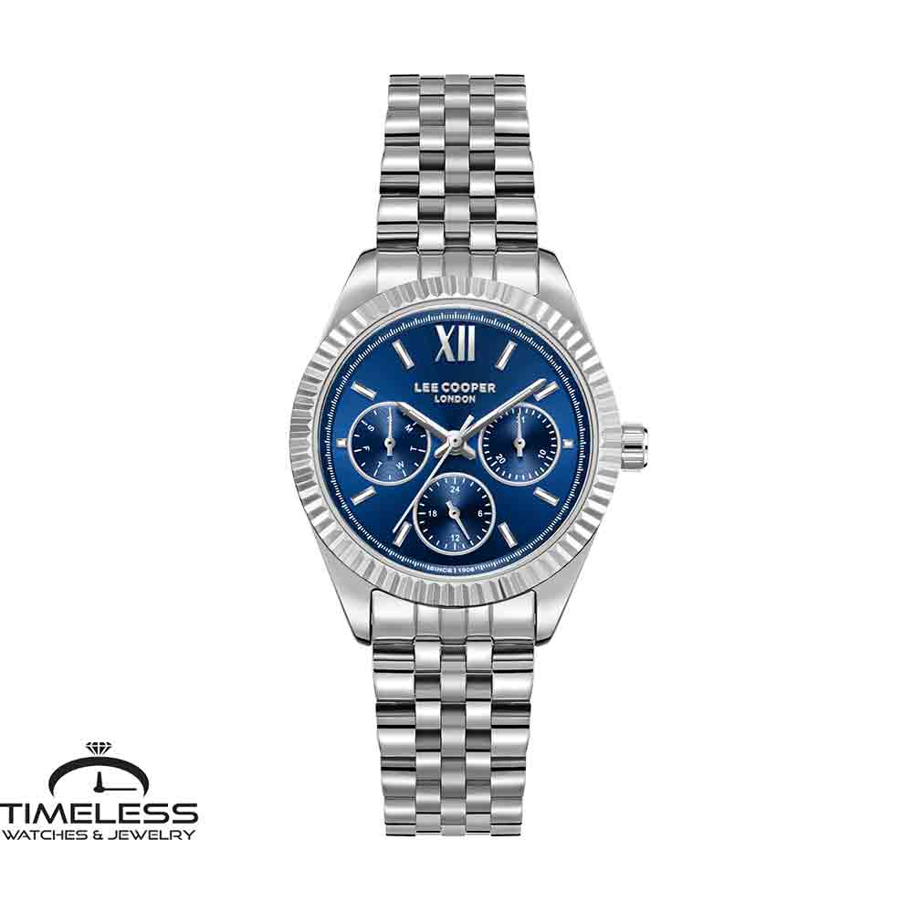 Бренд: Lee Cooper Боја: Сребрена, сина Материјал на ремче: Не рѓосувачки челик Материјал на часовник: Не рѓосувачки челик Форма на часовник: Круг Механизам: Кварцен Тип на механизам: Аналоген Календар: Ден, датум Отпорност на вода : 3 ATM Пол: Женски Стил: Класика, за секој ден Гаранција: 2 години