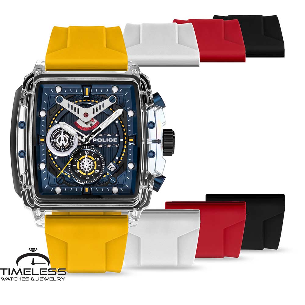 Бренд: Police Боја: Жолта, бела, црвена, црна Материјал на ремче: Гумено Дијаметар: 43 мм Материјал на часовник: Не рѓосувачки челик Форма на часовник: Правоаголен Механизам: Кварцен Тип на механизам: Аналоген со хронограф Календар: Ден, датум Отпорност на вода : 3 ATM Пол: Машки Стил: Секојдневен Гаранција: 2 години