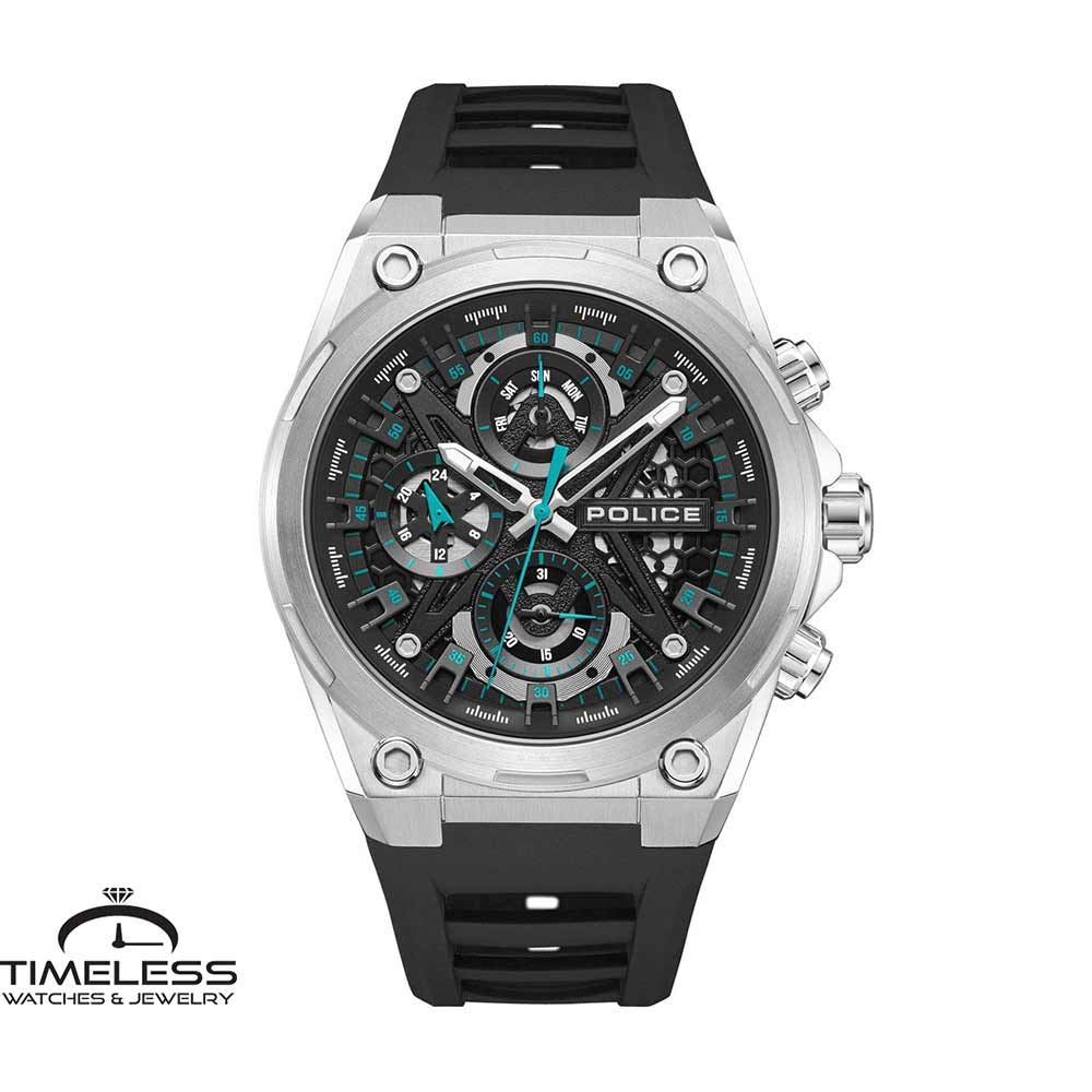 Бренд: Police Боја: Црна, сребрена, сина Материјал на ремче: Гумено Дијаметар: 45 мм Материјал на часовник: Не рѓосувачки челик Форма на часовник: Круг Механизам: Кварцен Тип на механизам: Аналоген Календар: Ден, датум Отпорност на вода : 5 ATM Пол: Машки Стил: Спортски, за секој ден Гаранција: 2 години